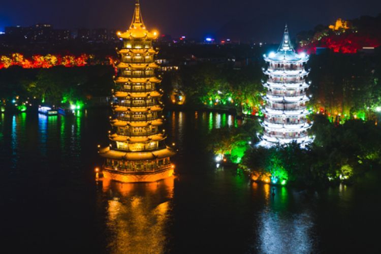 1:【日月双塔】日月双塔三项世界记录,是桂林的地标建筑,也是桂林人晚间散步必去的景点之一。日塔为铜塔,用铜350吨,月塔为琉璃塔。每到夜晚,两座塔在灯光映衬下分别散发着金银两色光芒。可以在杉湖沿岸观看双塔的美景。